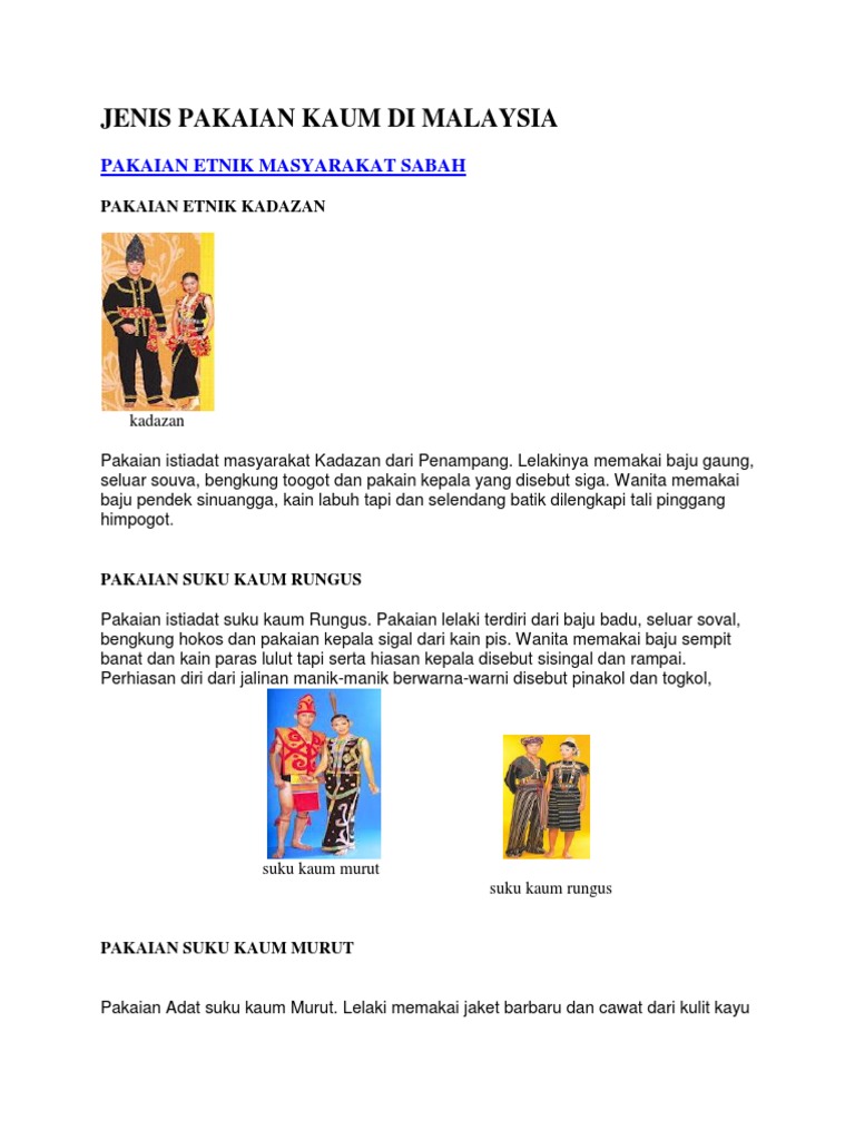 Pakaian wanita murut disebut sebagai pinongkoloh yang merangkumi baju berlengan pendek dikenali sebagai sampayau dan kaun sarung yang disebut sebagai tapi'. Sarung (tapi) berwarna hitam paras bawah lutut. Lelaki memakai jaket barbaru dan cawat dari kulit kayu puputul yang dilukis dengan motif dari manik atau warna. Apr 17, 2012 · pakaian tradisional suku kaum murut bagi pakaian adat suku kaum murut, lelaki memakai jaket barbaru dan cawat dari kulit kayu puputul yang dilukis dengan motif dari manik atau warna. Aug 21, 2010 · pakaian tradisional kaum murut.